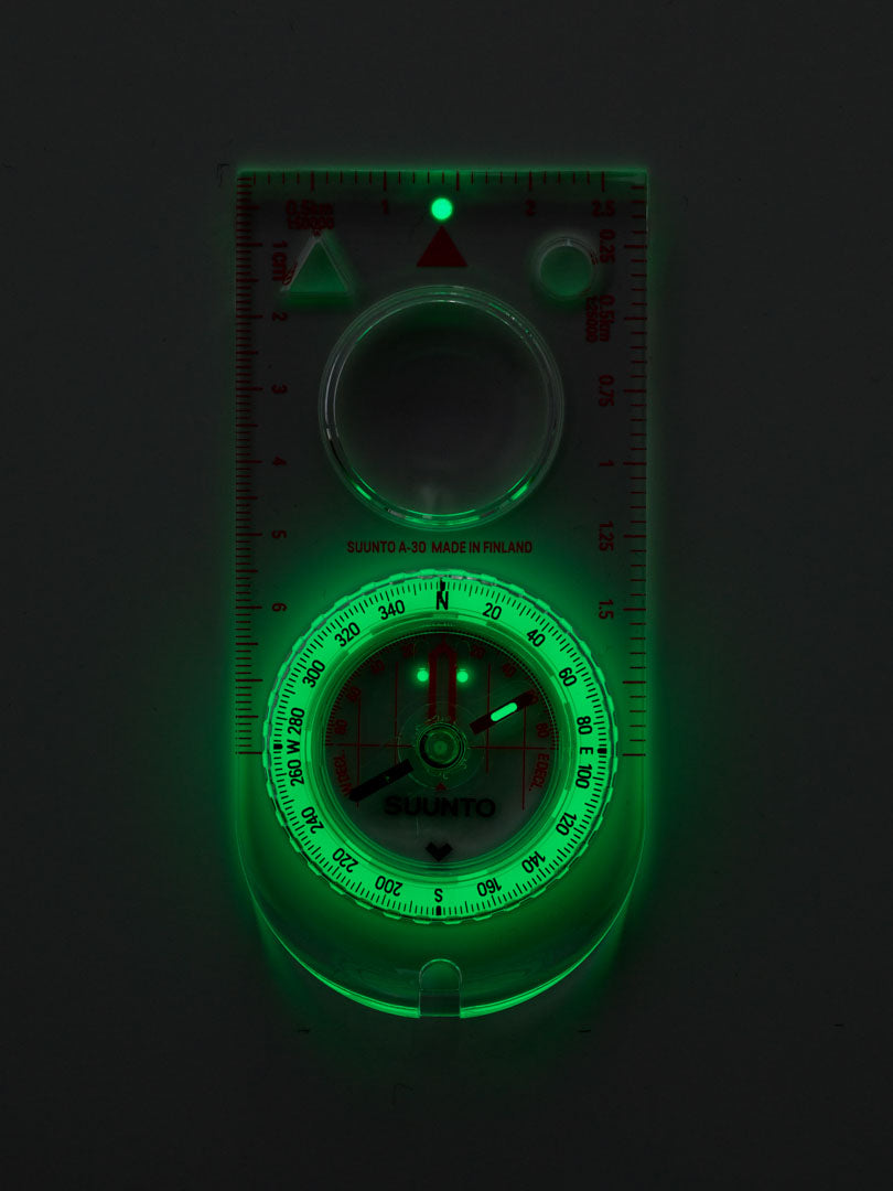 The material under the transparent directional scale with black prints is luminescent.