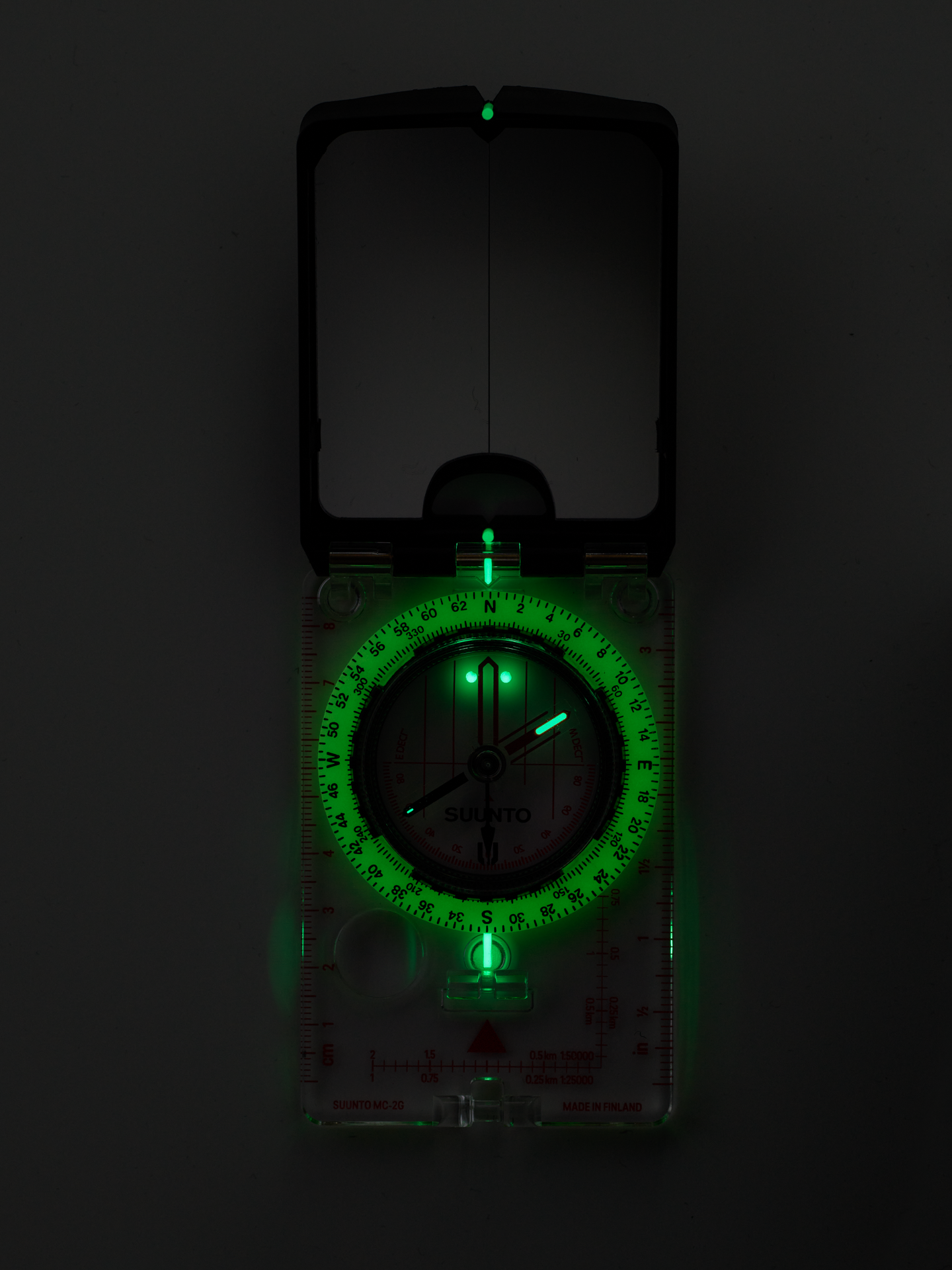 One luminescent forward bearing index at the hinge of the mirror lid and one luminexcent back-bearing index line at the opposite side of the protractor. Both lines are next to the protractor.