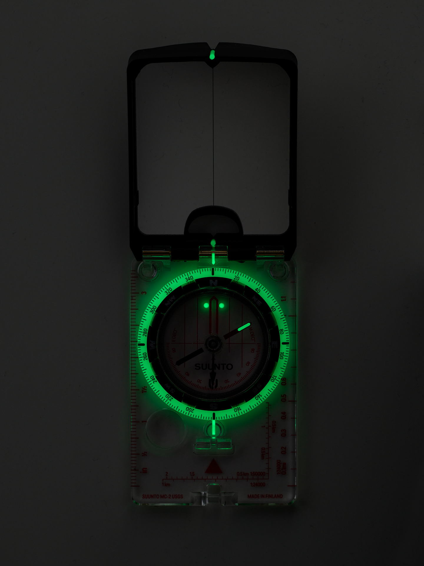 One luminescent forward bearing index at the hinge of the mirror lid and one luminexcent back-bearing index line at the opposite side of the protractor. Both lines are next to the protractor.